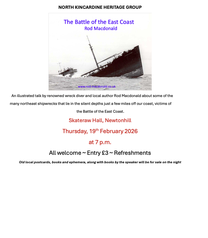 Looking forward to talking about some of our local WWII shipwrecks, victims of the Battle of the East Coast, tomorrow night Thursday 19 Feb at 1900 at the Skateraw Hall in Newtonhill. Its open to the public if anyone fancies an evening at the bottom of the North Sea!